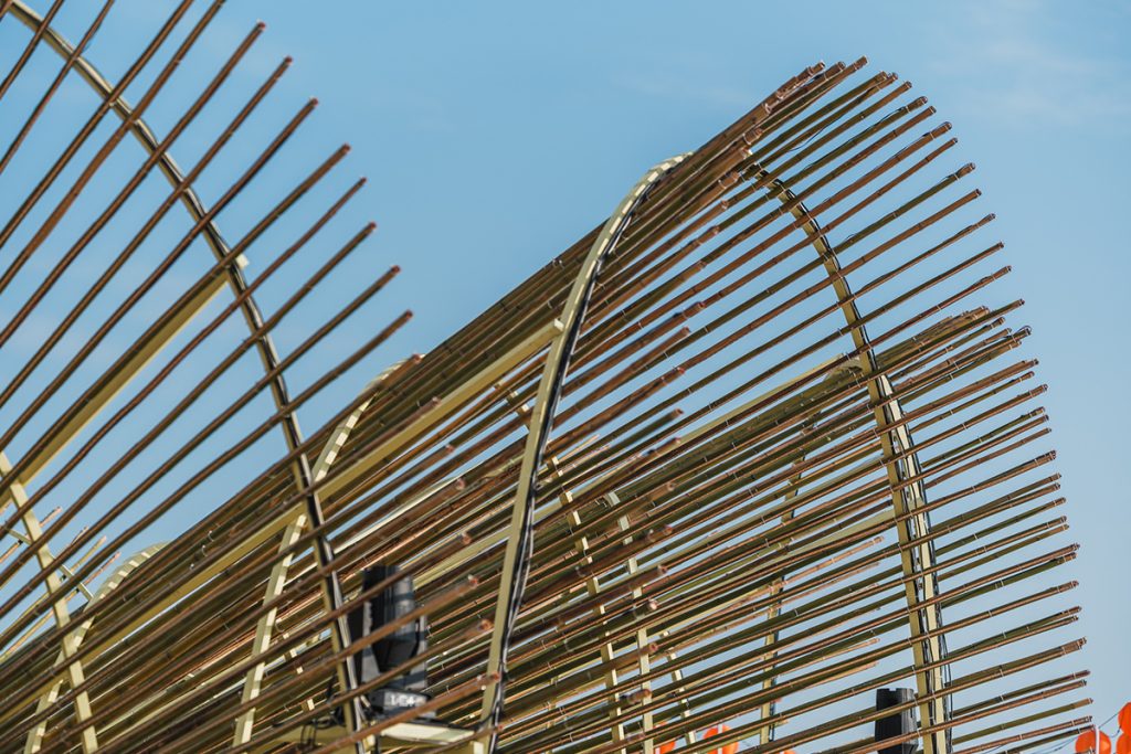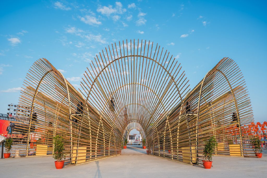《光之呼吸》以竹與鐵構築出一個環繞的場域。交織而成的弧線,如山林間靜立的巨大神木,以溫柔而堅韌的姿態環抱著人群。走入其中,光影隨時間推移而拉長、 斷裂、交錯,宛如自然呼吸的軌跡,也映照出自身的身影。當光影漸次延展,縫隙間灑落的光成為方向; 時而隱藏,時而浮現的身影,似幻亦真,映照自己的那道光即是方向。在這裡,身體與空間彼此回應。隨著一呼一吸,在虛 與實的交錯中,感知自身的存在,也感知與自然、與他 人、與天地之間真切的連結。