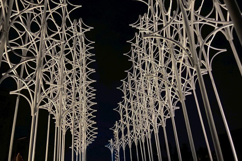 Between day and night, light spreads through the air like a steady breath, weaving through layered structures to reflect the rhythm between people and space. In this field, interlaced with star-shaped components, subtle misalignments and connections emerge with every shift of perspective—much like a slow-flowing encounter. As observers step inside, their silhouettes become filaments of light, drawing out soft ripples of shadow. The golden glow warmly envelops the space, cradling the movement of breath and body. Every motion becomes a delicate variation, as if memories are being rewritten in light—fleeting, yet profoundly real.