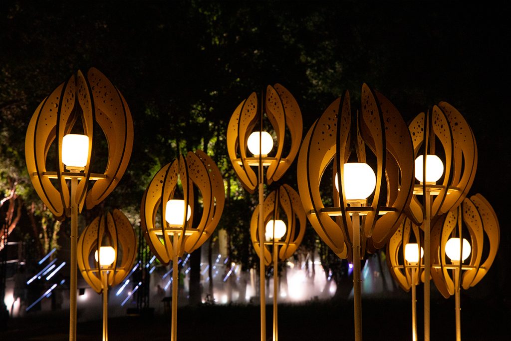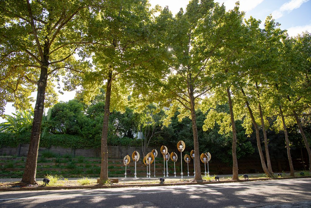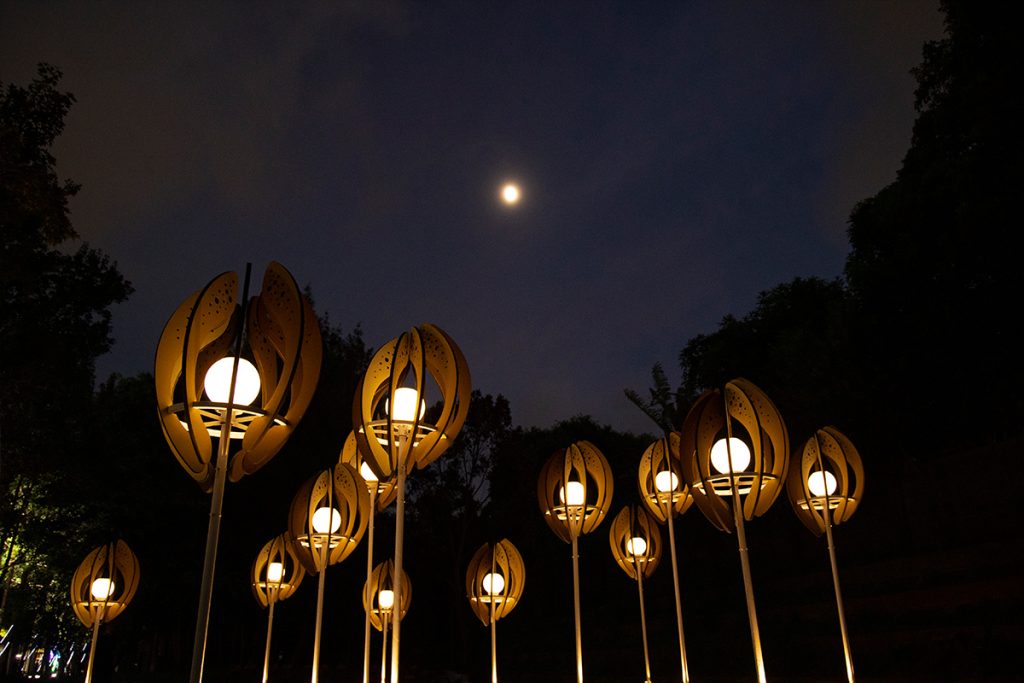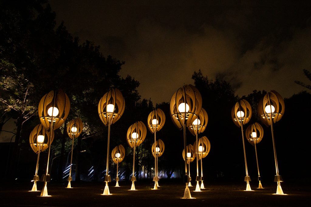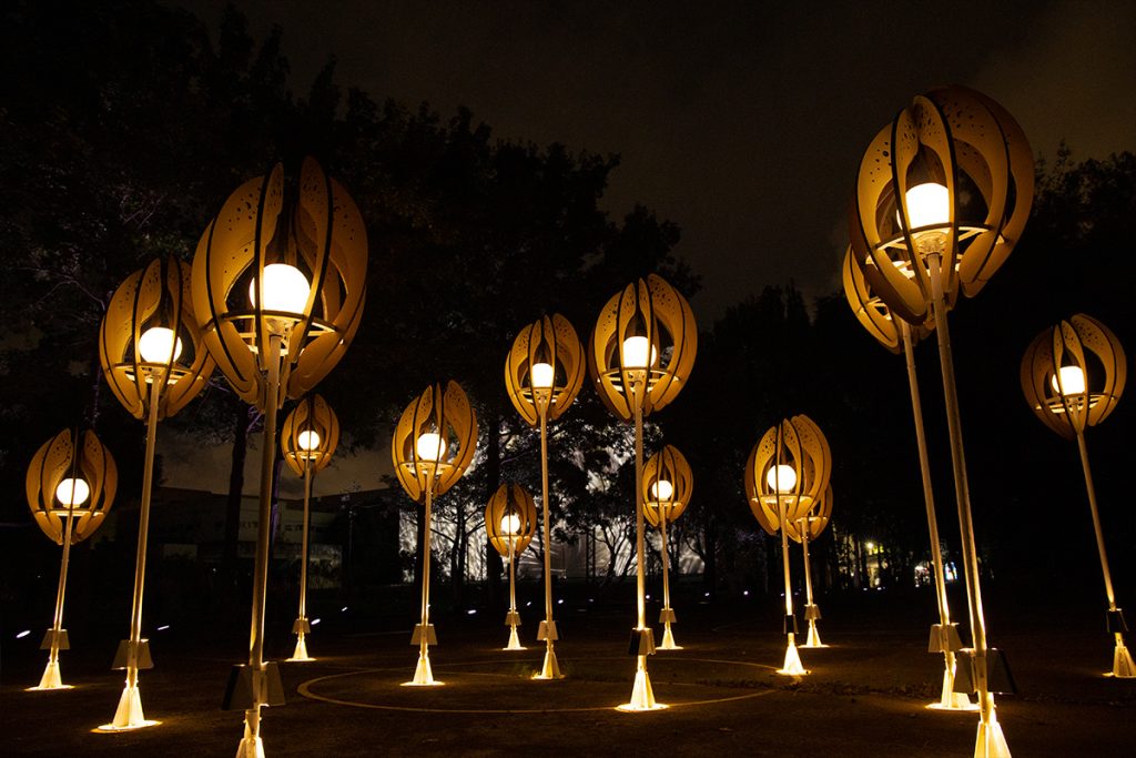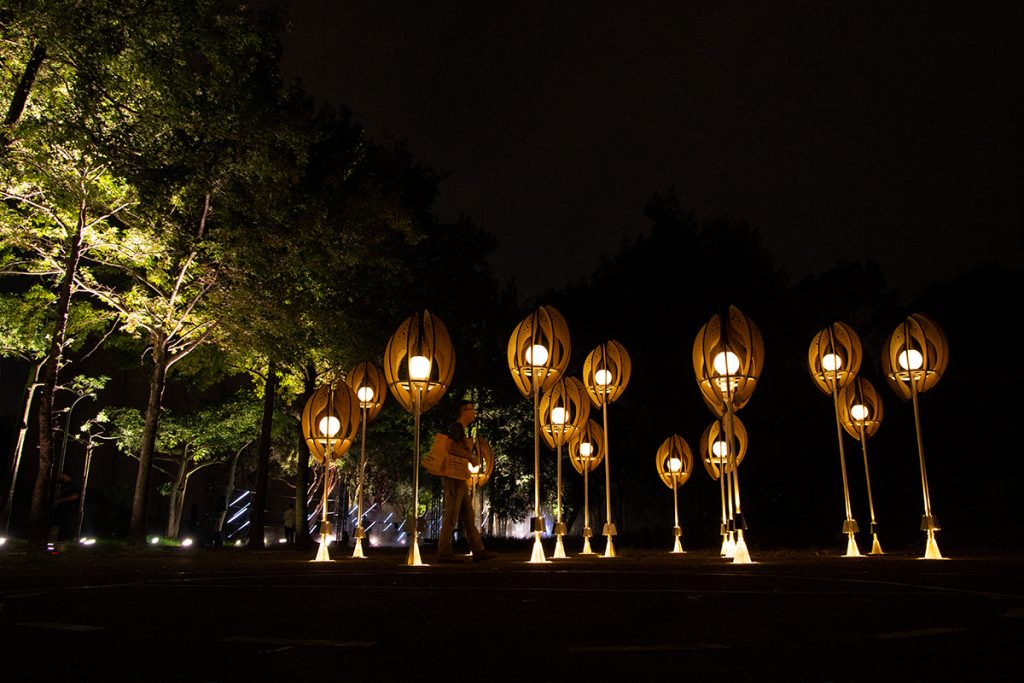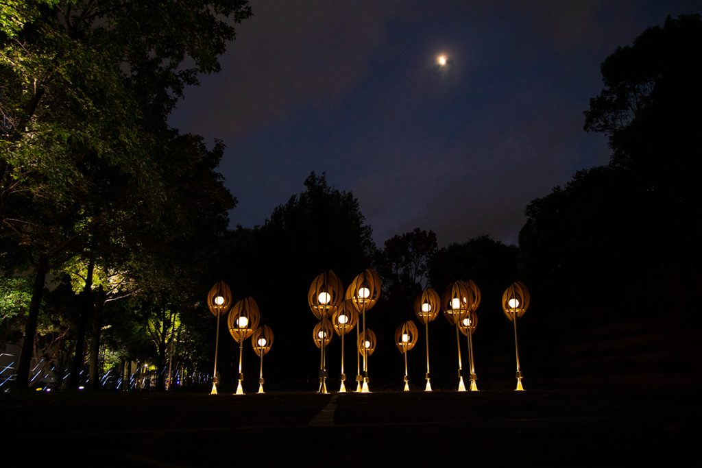 The work “Seed of the Brews” transforms the image of brew’s rice. Wrapping the white-core of rice with rounded arcs, the color shows the process of rice from harvesting to shelling and polishing into polished rice. From planting to harvesting, from cooking to fermentation, from filtration to clarification, from maturation to blending. The brewing process is like a seed, needing to be cultivated and grown over time. And the pure lightpoints exude energy, connecting the nourishment given by this land.