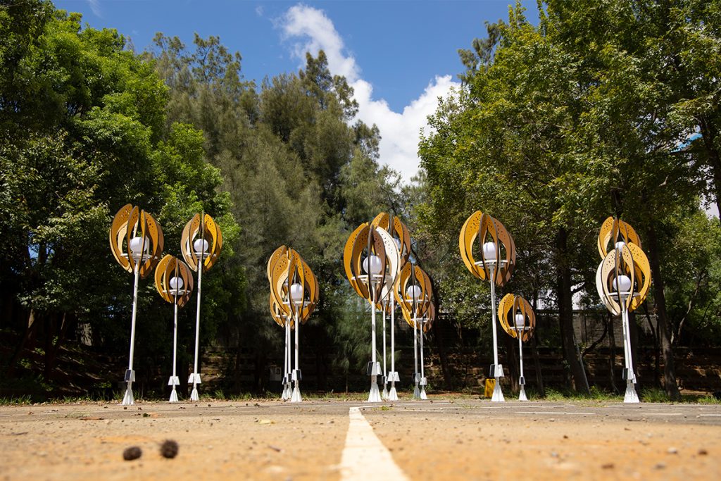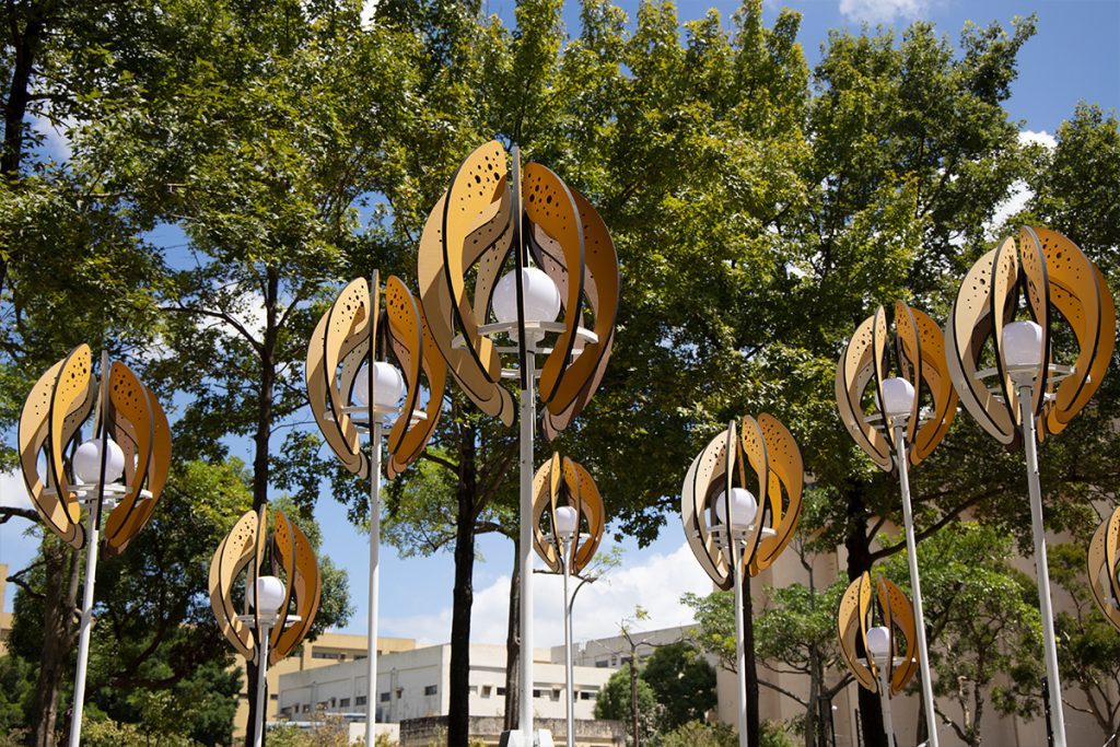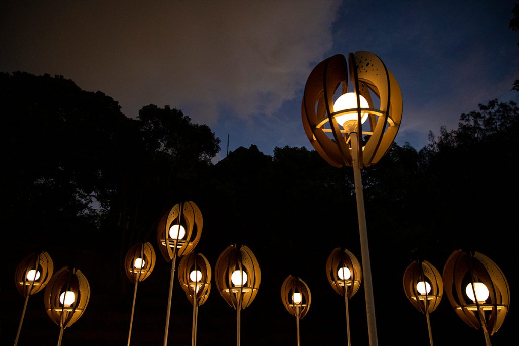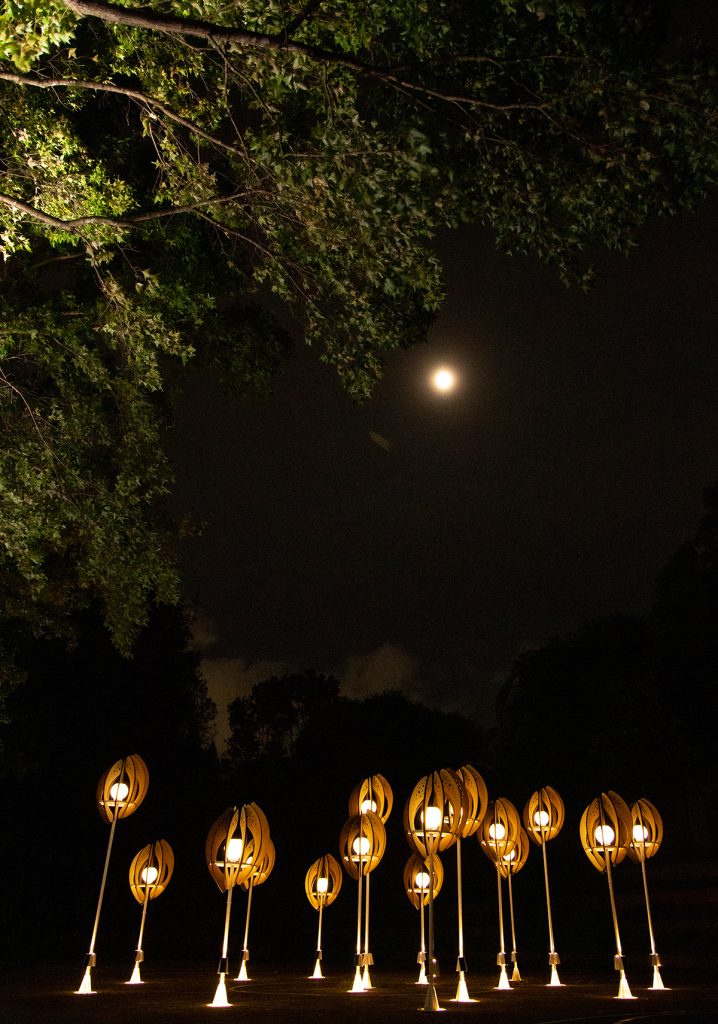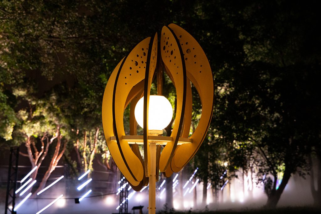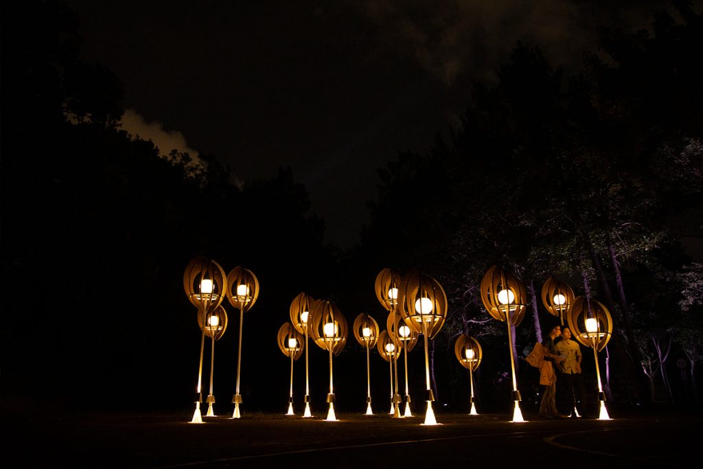 The work “Seed of the Brews” transforms the image of brew’s rice. Wrapping the white-core of rice with rounded arcs, the color shows the process of rice from harvesting to shelling and polishing into polished rice. From planting to harvesting, from cooking to fermentation, from filtration to clarification, from maturation to blending. The brewing process is like a seed, needing to be cultivated and grown over time. And the pure lightpoints exude energy, connecting the nourishment given by this land.